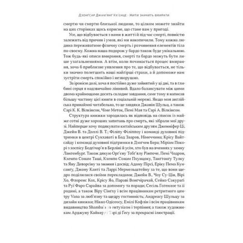 Книжка зацікавить не тільки буддистів, а й тих, хто коли-небудь втрачав, боїться втратити або просто хоче знайти емоційну рівновагу і жити глибшим та наповненішим життям. Бо жити значить вмирати. Якщо прийняти це твердження, життя стає усвідомленішим.
