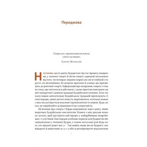 Для більшості людей смерть — незручна тема, якої краще уникати. Хоча це природна частина життя — те, що робить наш світ справжнім, а наші дні — значущими. Автор опирається на буддійське вчення про смерть, вмирання та бардо (проміжний стан), але не викладає його як жорстку релігію чи доктрину лише для «своїх». Він ділиться порадами, як-от: