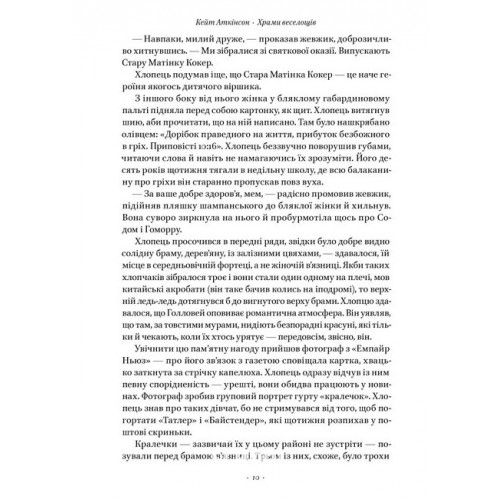Наш Формат Храми веселощів., Кейт Аткінсон 978-617-8120-59-7 Новий історичний роман Кейт Аткінсон “Храми веселощів” запрошує читача в лабіринти нічного життя і кримінального світу міжвоєнного Лондона. У місті, яке тільки починає оговтуватися після Першої світової війни, ті, кому пощастило вціліти, намагаються взяти від життя все.
