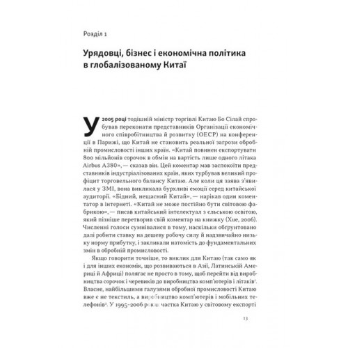 Авторка виходить за межі звичайного аналізу. Вона описує перехід від виробництва дешевих товарів до високих технологій, глибоко занурюється в політичні стратегії, економічні інтриги і взаємодії держави та бізнесу в одному з найдинамічніших ринків світу. Лін Чень розкриває, як китайські чиновники впливають на глобальні процеси, змінюючи правила гри на міжнародному ринку.