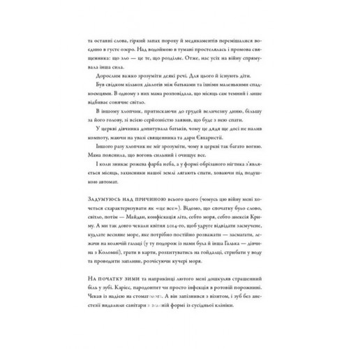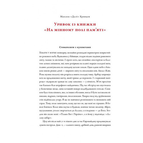Наш Формат На мінному полі пам'яті. Щоденники, есеї, оповідання., Кривцов Максим 978-617-8437-02-2 Пам’ять скріплює і тримає. Сьогодні вона міцна, як і кава на передку, та на завтра спогади блякнуть, розчиняючись у буденних турботах. Але є те, що врізається надто глибоко, аби зникнути: це війна. Пережите не стирається й не зникає. Достатньо лише заплющити очі — і пам’ять, мов старий кінопроєктор, знову оживляє кадри, від яких не втечеш.