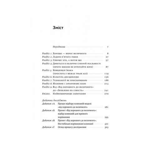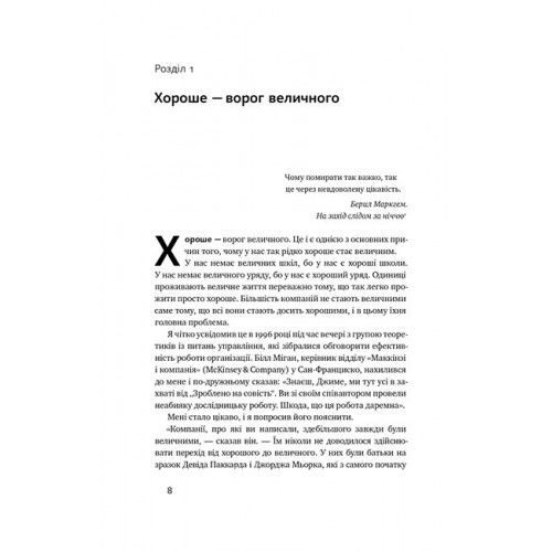 Якщо ви відчуваєте, що до певного етапу піднімалися вгору, а вже кілька років пробуксовуєте на місці, то ця книжка — той червоний прапорець, який покаже, що ви робите не так і куди слід почати рухатися, щоб пробитися у вищу лігу бізнесу. Джим Коллінз пояснить, як вивести компанії, громадські і державні організації та установи з хорошого на величний рівень.