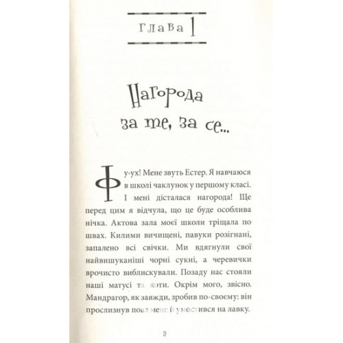 Наша Ідеа Естер і Мандрагор. Том 1. Чаклунка та її кіт., Марі-П'єр Одду, Софі Дьйоед 978-617-7678-18-1 У Школі чаклунок відповідальний день: відзначення найкращих учениць. Уперше Вищу нагороду за Допитливість вручають одній із них – Естер Фльордефер. І як заохочення її відправляють в Інший світ, але з однією умовою: ніхто не має заскочити її під час використання магії. Тож разом зі своїм котом Мандрагором, що вміє розмовляти, вона вирушає у Світ людей. Але ж як важко стриматися від того, щоб не використати заклинання, адже вони часом так потрібні! Особливо якщо треба допомогти маленькій дівчинці і її кошеняті знайти одне одного.