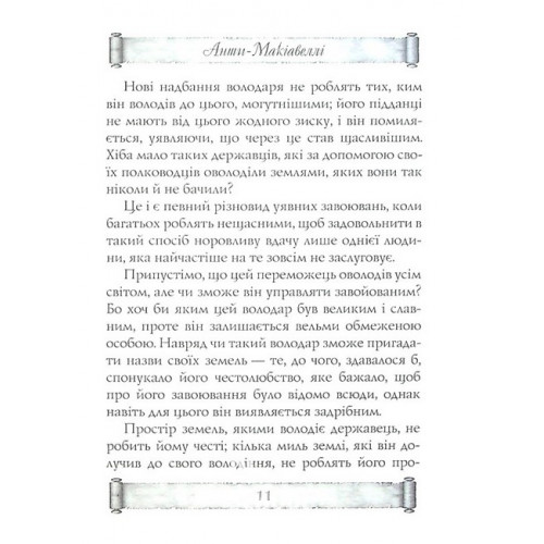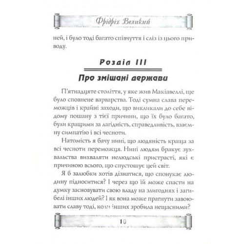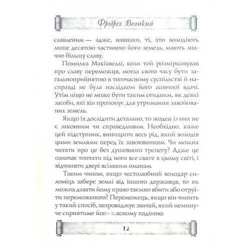 Видавництво "Арій" АНТИ-МАКІАВЕЛЛІ.Настанови про воєнне мистецтво., Фрідріх Великий 978-966-498-804-6 Ця книжка знайомить читача з роботами короля Пруссії Карла Фрідріха ІІ (1712–1786), який увійшов до історії як Фрідріх Великий. Він був генієм війни, солдатом та інтелектуалом, крім своєї рідної — німецької мови, володів французькою, англійською, іспанською, португальською та італійською; читав латиною, грецькою та давньогрецькою, івритом, був автором листів, які можна назвати шедевром епістолярного жанру XVIII століття, законодавцем та спритним політичним інтриганом. Однією з найблискучіших робіт Фрідріха Великого є політичний трактат «Анти-Макіавеллі», написаний у 1739–1740 рр., коли королю було лише 28 років. У ньому він полемізує з Нікколо Макіавеллі та його знаменитою книгою «Державотворець». Трактат став одним із найбільш читаних творів у освіченій Європі та не втратив своєї актуальності і в наші дні, а, навпаки, став надзвичайно затребуваний як вивірений порадник з управління. До видання також увійшов твір Фрідріха Великого «Наука військового мистецтва до своїх генералів» — праця, присвячена тактиці та стратегії ведення війни.
