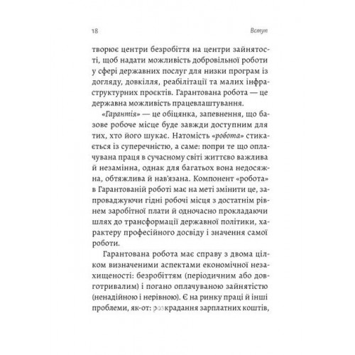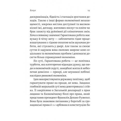 Пандемія призвела до величезних втрат – ринки обвалювалися один за одним, а безробіття хвилею прокотилося світом. Для того, щоб уникнути цього у майбутньому Чернева пропонує теоретичну модель «гарантованої роботи». У основі ідеї – можливість добровільного працевлаштування на державну службу кожному, хто цього потребує. Чітко та переконливо авторка перераховує численні переваги такої політики та пропонує план її впровадження.