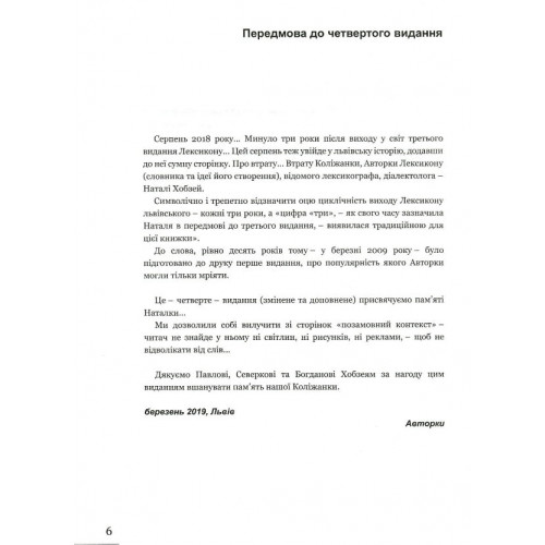 Видавництво Старого Лева Лексикон львівський: поважно і на жарт. - Наталя Хобзей, Оксана Сімович, Тетяна Ястремська, Ганна Дидик-Меуш 978-617-679-729-6 Фіксація особливостей мовлення Львова ХХ століття — мета цієї праці. Джерелами слугували насамперед власні спостереження авторок за словниковим фондом мовців рідного міста, а також художня та мемуарна література авторів-львів’ян. Особливістю книги є не тільки тлумачення багатьох, іноді уже призабутих слів, сталих словосполучень, фразеологізмів, прислів’їв та приказок, а й розлогі цитати, у яких згадано про львівські традиції й звичаї, історичні події, особливості побуту. Героями цих мініоповідок є не тільки вигадані персонажі, а й часто відомі львів’яни.