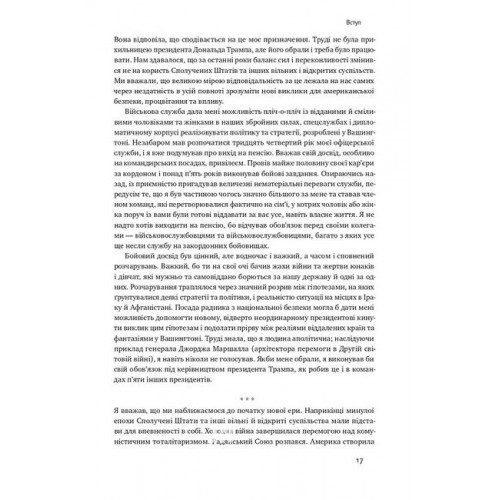 Це мемуари одного з найавторитетніших американських генералів. Щоб пояснити витоки сучасних протистоянь, автор робить важливі екскурси в історію, завдяки досвіду радника президента США з нацбезпеки показує закулісся міжнародних перемовин найвищого рівня.