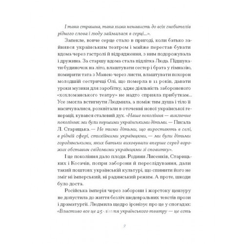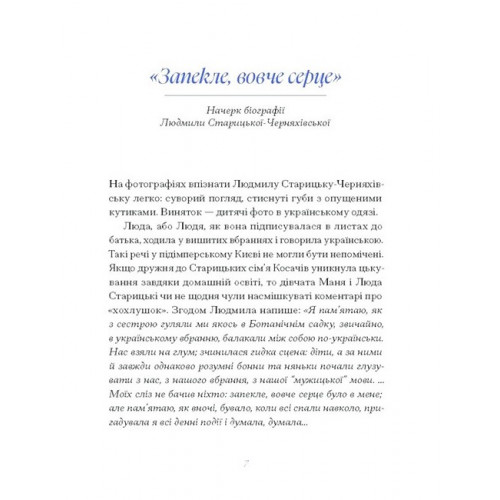 Видавництво "Ще одну сторінку" Людмила Старицька-Черняхівська. ВИБРАНЕ: художня проза, спогади., Людмила Старицька-Черняхівська 978-617-522-261-4 Зі школи нам відомі імена Михайла Старицького — корифея українського театру, Лесі Українки — «доньки Прометея». А донька першого, близька подруга другої з самого дитинства — Людмила Старицька-Черняхівська — постать нам незнайома. Вона все життя стояла в тіні тих, про кого дбала, а проте творила і працювала не менше, аніж вони. Її тексти і досі в тіні історії, її спогади досі мало хто чув. Пора пролити на них світло.