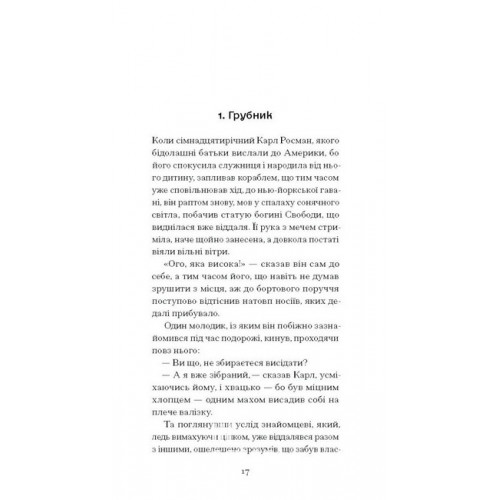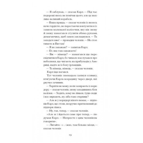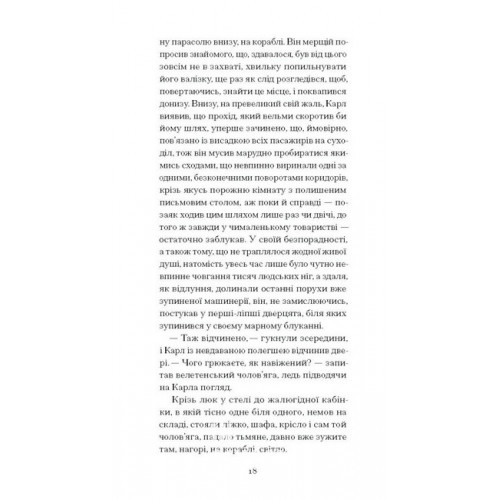 Видавництво "Ще одну сторінку" Зниклий безвісти., Франц Кафка 978-617-522-228-7 «Зниклий безвісти» — перший роман Франца Кафки, незавершений рукопис якого Макс Брод знайшов після Кафчиної смерти 1924 р. і видав під заголовком «Америка»; саме з цього тексту, вочевидь, виростає автор таких славетних творів світової класики, як «Замок», «Процес», «Перетворення». Цей прикметно модерністський «роман виховання» — розповідь про юнака-емігранта, своєрідна історія змужніння, сподівано для Кафки радше сувора й не вельми милосердна, ніж погідна й привітна, повна непередбачуваних поворотів долі, а однак, розказана спокійно й легко, подекуди навіть грайливо, без фаталізму і абсурдности, притаманних пізнішим авторовим творам.