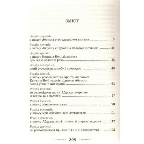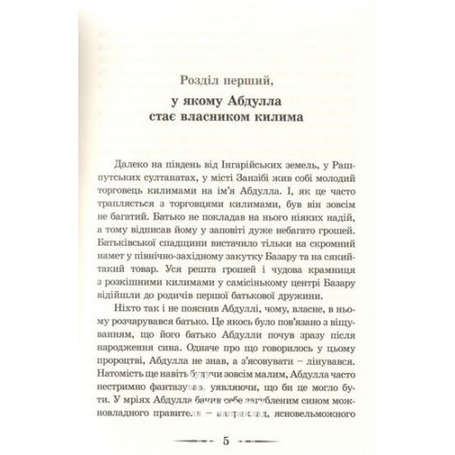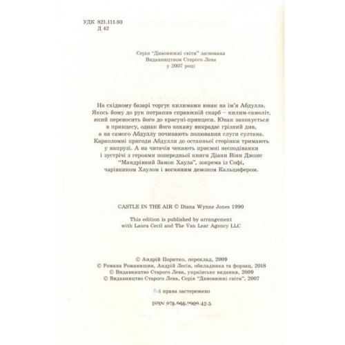 Видавництво Старого Лева Повітряний замок. - Діана Вінн Джонс 978-966-2909-42-5 Якось йому до рук потрапив справжній скарб – килим-самоліт, який переносить його до красуні-принцеси. Юнак закохується в принцесу, однак його кохану викрадає грізний див, а на самого Абдуллу починають полювання слуги султана. Карколомні пригоди Абдулли до останньої сторінки тримають у напрузі. А на читачів чекають приємні несподіванки і зустрічі з героями попередньої книги Діани Вінн Джонс «Мандрівний Замок Хаула», зокрема із Софі, чарівником Хаулом і вогняним демоном Кальцифером.