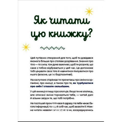 Тут ти довідаєшся, яких змін зазнає? твоє тіло під час статевого дозрівання, як змінюються емоції та самосприйняття, а також про те, як дбати про себе, ставати сильнішим і завжди залишатися собою.