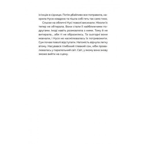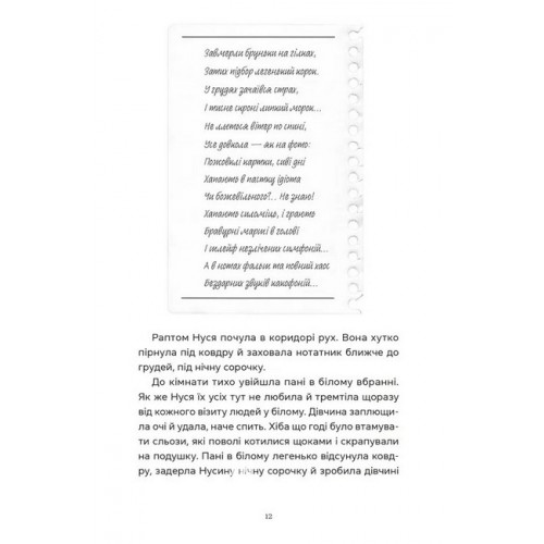Нуся мріє про сцену, про можливість виступати перед публікою. Проте в’язницею для неї стали лікарняні стіни. Єдина розрада — вірші, які Нуся потайки записує у блокноті.