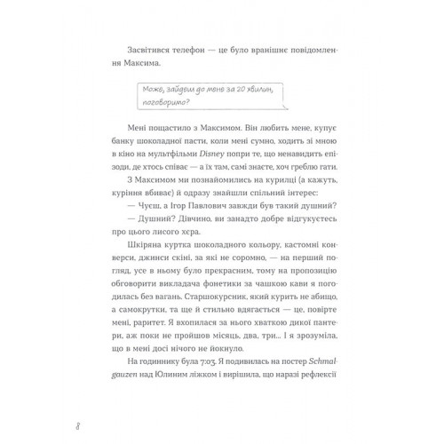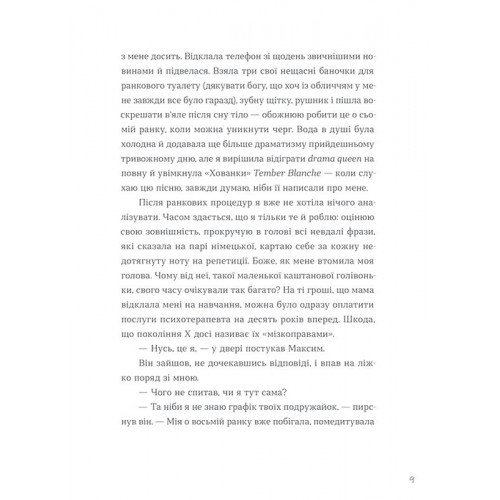 Разом із героїнею відверто щирої дебютної повісті солістки гурту Tember Blanche ти вирушиш у непрості пошуки власного «я» — і ніколи про це не пожалкуєш.