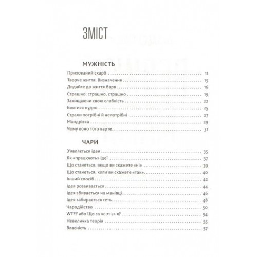 Видавництво Старого Лева Велика магія. - Елізабет Ґілберт 978-617-679-414-1 Елізабет Ґілберт — авторка світових бестселерів «Їсти, молитися, кохати» й «Природа всіх речей» — з нестримною енергією і витонченим гумором розповідає про те, як навчитися жити творчо й отримувати від цього насолоду. Вона переконана, що творчість — це дар, і тільки від нас залежить, чи ми ним скористаємось. Та не чекайте тут практичних порад на зразок тих, як збудувати блискучу кар’єру в царині мистецтва. Адже письменниця вважає, що всі ми — люди творчі, тому шукає відповіді на питання, які хвилюють кожного.
