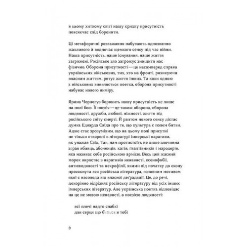 Поезії Ярини Чорногуз — це своєрідні листи з фронту, листи з передової, де ти не знайдеш опису бойових дій чи переліку звільнених територій. Це листи про біль від утрати загиблих побратимів та посестер, листи про буття на війні тут і зараз, про усвідомлення та прийняття власного вибору піти воювати, листи про те, як виглядатиме світ після всього цього болю, що розриває зсередини. Листи про те, як виглядає оборона твоєї присутності в цьому світі.