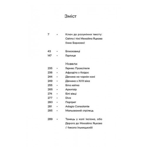 У цьому виданні зібрано твори Яцкова, які відображають цей тематичний спектр: від повісті «Горлиця» — одного з небагатьох в українській літературі текстів, де осмислюється досвід Першої світової війни, до новел, де центральним питанням є психологія творчості.