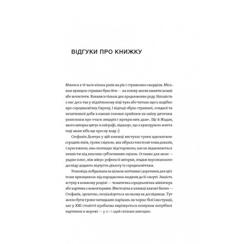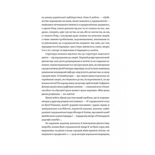 Середньовіччя таке далеке від нас, що, почувши згадку про цей період часу, ми продовжуємо малювати в голові ту картинку, яку побачили колись у кількох поганих фільмах. Та чи справді середні віки були такими жахливими? Історикиня Стефанія Демчук, стверджує, що ні, середньовіччя не було ані темним, ані диким. У своїй книжці авторка розповідає, як усе відбувалося насправді: що їли та пили люди, як виховували дітей, чого боялися і як святкували.