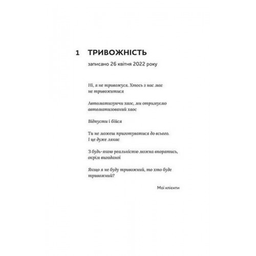 Будь-яка емоційна реакція є нормальною відповіддю на ненормальні обставини війни, стверджує психотерапевт Володимир Станчишин. Ми маємо право відчувати лють, маємо право хотіти помсти, ми можемо вмикати чорно-біле мислення і не відчувати при цьому провини. Ми можемо сумувати, ми можемо плакати стільки, скільки потрібно. Це книжка про емоції цивільних людей у тилу: про тих, хто залишився в Україні, й тих, які були змушені покинути свої домівки, всіх, хто волонтерить, донатить і чекає рідних з фронту, всіх, хто кожен свій день починає з новин та прокидається від сповіщень про повітряну тривогу. Ми не обирали жити в час історичних змін, але війна це те, від чого не можна абстрагуватися, тому наше завдання наразі — навчитися справлятися на своєму особистісному рівні, жити, аби перемогти в цій війні.