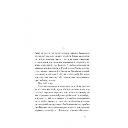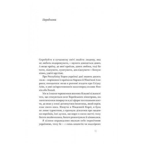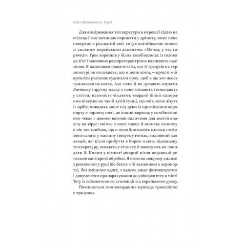 У цій книжці Ольга Мужановська ділиться своїм досвідом занурення у повсякденне життя Кореї, розповідає про її культуру й історію, географію та економіку. Вона говорить про місцеву кухню й традиційний одяг, особливості спілкування й стандарти поведінки, пояснює, чому українцю, аби вивчити корейську, доведеться фактично перебудувати власний мозок, щоб звикнути до відсутності розділових знаків. Також авторка не приховує і темної сторони життя корейців та розповідає, як за красивою картинкою можуть ховатися ієрархічність суспільства, самогубства та домагання.