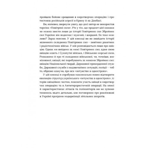 У своїй новій книжці Андрій Харук детально описує тернистий шлях формування української військової та воєнізованої авіації з моменту здобуття незалежності й до початку повномасштабного вторгнення. Він розповідає, як змінювалася з роками структура та склад нашої авіації, як модернізували літальні апарати і як українському летунству вдавалося забезпечувати перевагу над противником у зоні АТО.