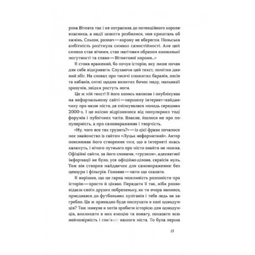 Олександр Котис у своїй книжці не просто змальовує основні віхи історії Луцька, він фактично знайомить нас із життям міста за різних часових періодів і тими, хто творив його сучасний ландшафт. Стартуючи в центрі Луцька, автор проводить нас вуличками міста, вміло балансуючи поміж легендами й історичними фактами. Він не обмежується оповідями про величні храми та замки, а водночас розповідає, якими стежками гуляли місцеві монахи та якими свого часу були особливості політики, як вигравалися битви і забудовувалося місто.