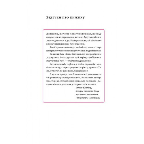 Ця книжка для мам, щоб підтримати і надихнути; майбутніх мам, щоб налаштуватись і знати, чого чекати; бабусь, щоб згадати і пережити знову; і татусів, щоб краще зрозуміти всіх цих дам.