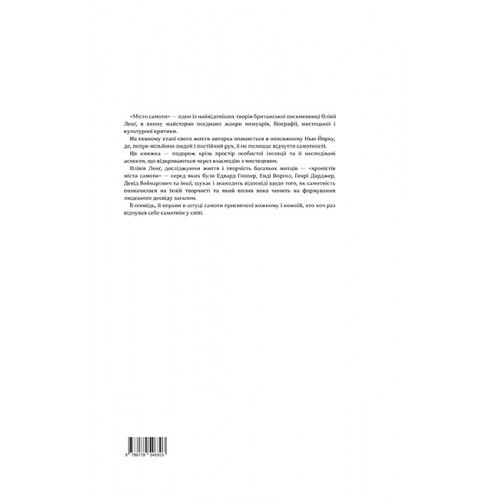 Віхола Місто самоти., Оливия Лэнг 978-617-9546-30-3 «Місто самоти» — один із найвідоміших творів британської письменниці Олівії Ленґ, в якому майстерно поєднано жанри мемуарів, біографії, мистецької і культурної критики.