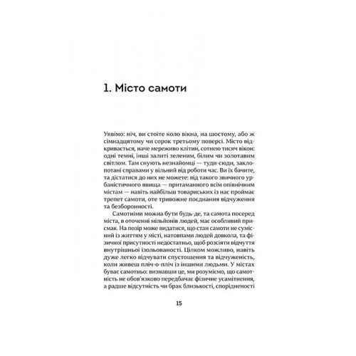 Олівія Ленґ, досліджуючи життя і творчість багатьох митців — «хроністів міста самоти» — серед яких були Едвард Гоппер, Енді Воргол, Генрі Дарджер, Девід Войнарович та інші, шукає і знаходить відповіді щодо того, як самотність позначилася на їхній творчості та який вплив вона чинить на формування людського досвіду загалом.