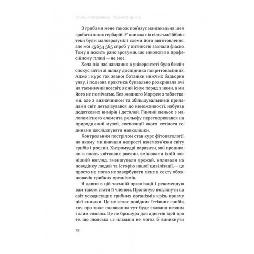 Насправді все, звісно, складніше. І про це у своїй новій книжці розповідає ботанік Олексій Коваленко. Що спільного у Плінія Старшого і глив? Які гриби із собою носила «снігова людина»? Танцювальна чума, полювання на відьом і як до всього цього причетні гриби? Скільки коштує найдорожчий гриб у світі та як гриби долучилися до картопляного голоду в Європі? Які гриби росли на стінах 4-го енергоблока та хто згубив австралійських спортсменів?
