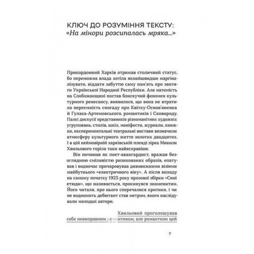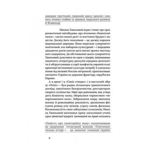 У цій книжці ви знайдете три твори Миколи Хвильового — «Повість про санаторійну зону», «Сентиментальна історія» та «Я (Романтика)». Тексти, за якими можна уявити, яким він був, якою була та епоха. Персонажі Хвильового — «безґрунтовні романтики», герої, сповнені розпачу, не здатні навести мости між власним романтичним світоглядом і реальністю, в якій ці цінності втрачають сенс.