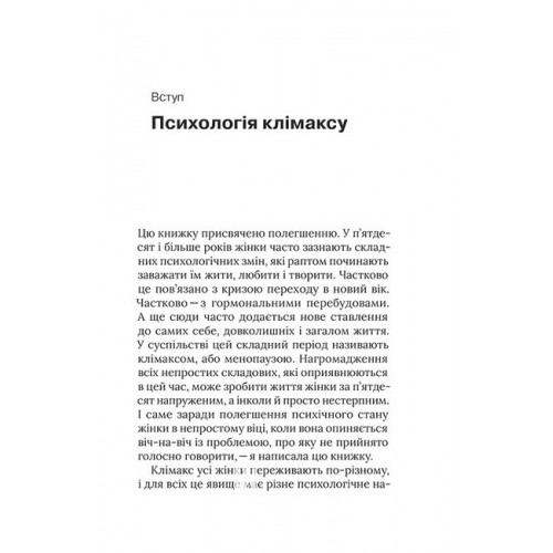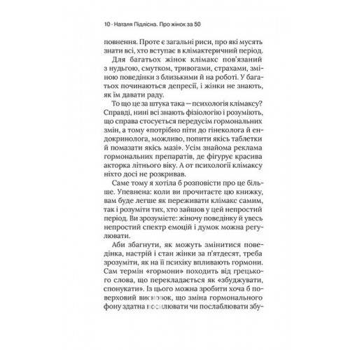 У цій книжці психологиня Наталя Підлісна пояснить особливості жіночих вікових змін, наведе приклади із власної психологічної практики, базовані на реальних історіях, і переконає, що нічого страшного з вами не трапилося, а незручне в нашому суспільстві слово «клімакс» — не таке страшне, як його малюють.