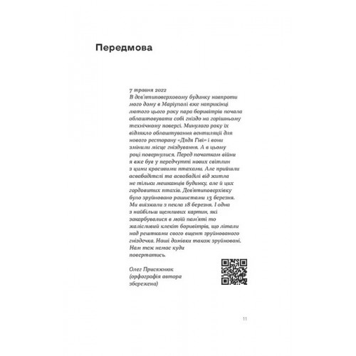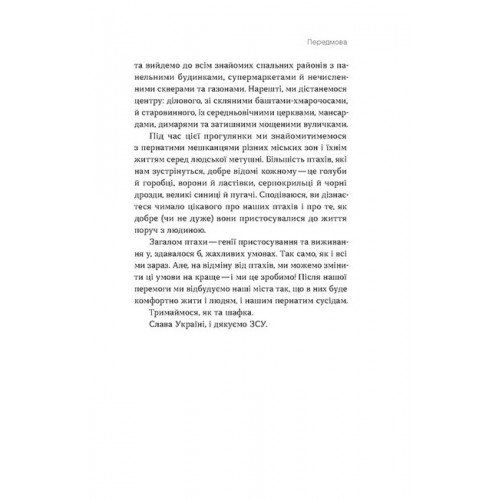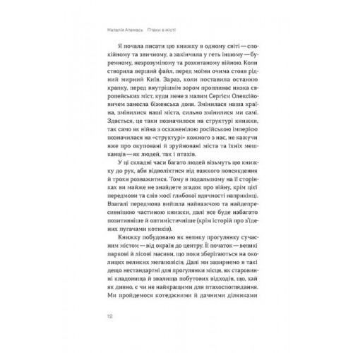 Нова книжка орнітологині Наталії Атамась розповідає історію птахів у місті: де вони живуть і як доглядають пернату малечу, як вирішують болюче житлове питання та виборюють територію. Саму ж книжку побудовано як прогулянку – від околиць до центру, від парків та кладовищ до старих кам'яниць і хмарочосів.