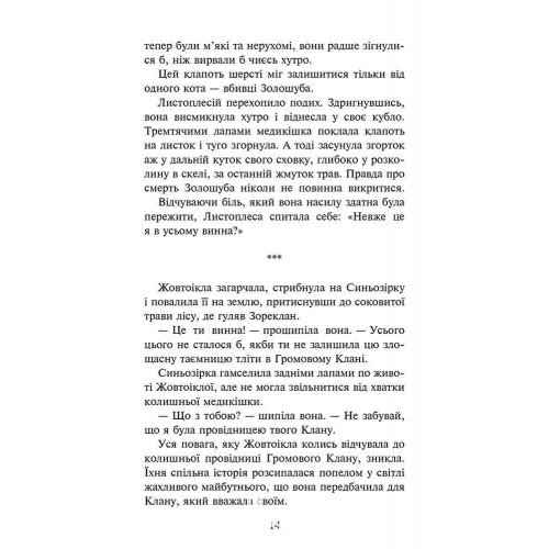 Коти-вояки. Сила трьох. Книга 6. Сходить сонце, Ерін Гантер 978-617-8229-20-7 Шоста книга третього циклу «Сила трьох» серії світового бестселера «Коти-вояки».Загадкова смерть Золошуба переполохала весь Громовий Клан. Щоб з’ясувати, чиїх це лап справа, вояки вирушають до Сонцеспаду. Вперто долаючи численні небезпеки на своєму шляху, вони й не здогадуються, що всі відповіді приховані у їхньому Клані. Троє обраних вже за мишачий хвіст від того, щоб дізнатися правду. Та у вихорі таємниць, які ось-ось вихопляться назовні, вони ризикують втратити геть усе: віру в пророцтво Зореклану, вояцький правильник, ба навіть життя…