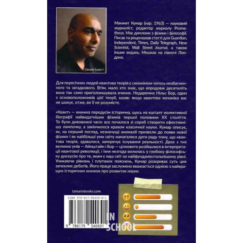 Бородатий Тамарин Квант. - Манжит Кумар 978-617-95406-9-1 «Квант» — книжка передусім історична, щось на кшталт колективної біографії найвидатніших фізиків першої половини XX століття. То були дивовижні часи: все почалося зі спроб створити ефективнішу лампочку, а закінчилося крахом класичної науки. Кумар описує, як, на перший погляд, незначущі аномалії призвели до появи нової фізики і як найбільші уми світу намагалися дати раду тóму, що квантова теорія, здавалося, заперечує існування реальності. Двоє з тих великих умів — Айнштайн і Бор — цілковито розійшлися в інтерпретації квантової революції, і їхня незгода вилилась у глибоку філософську дискусію про те, яким є наш світ на найфундаментальнішому рівні.