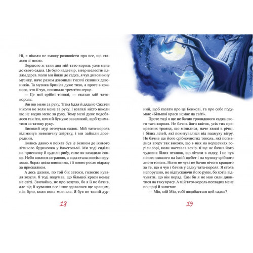 Рідна мова Міо, мій Міо., Астрід Ліндґрен 978-617-8280-87-1 Добре, коли в дитини є і тато, і мама. А якщо дитина — сирота? Коли вона самітна і нестерпно самітна, як-от дев’ятирічний Буссе, головний герой казкової повісті Астрід Ліндґрен? Тоді уява може запросто перенести хлопчика в Країну Далеку, де король — це його тато, а сам Буссе, як з’ясувалося, — справжній принц, Міо.