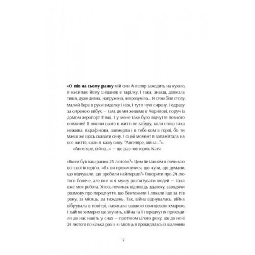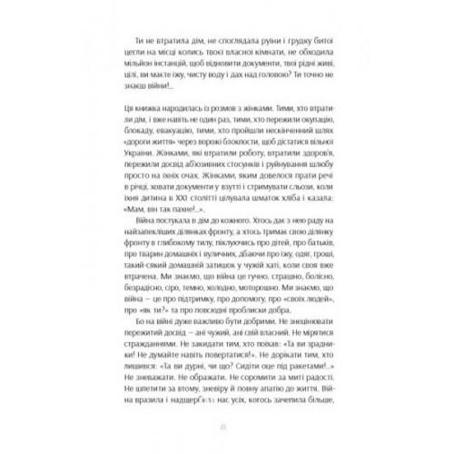 Видавництво "Ще одну сторінку" Та що ти знаєш про війну?!., Ольга Карі 978-617-522-164-8 Книжка художніх репортажів про важливість і цінність жіночого досвіду проживання війни — в окупації, в евакуації, у статусі біженки, у статусі ВПО, у тилових містах, у прифронтових містах, жінок молодих, жінок старших, з дітьми, з дітьми з інвалідністю, без дітей, з тваринами, із старенькими рідними — і подолання знецінення внеску жінок, які не були на передовій чи у війську, в перемогу. В основі книги — розмови із жінками про виклики, досвіди, емоції, з якими їх зіштовхнула повномасштабна війна. Охоплює теми: краса на війні, знецінення власних страждань і власного досвіду, домашній аб’юз, облаштування життя в евакуації, облаштування життя — власного та дітей — за кордоном, на новому місці, в статусі ВПО чи біженки, втрата дому, поколіннєве ретравмування (історії вірменок, чиї предки тікали від геноциду в Туреччині сто років тому, а потім тікали від війни в Карабасі, і тепер — з Донбасу — це в межах родової історії однієї родини), досвід виживання в окупації і виїзду на безпечні території, про творчість, яка рятує на війні, про бізнес, заснований жінками під час війни, про нову емоційну зрілість, місячні та жіноче здоров’я на війні та розмови про те, яким буде життя після війни.