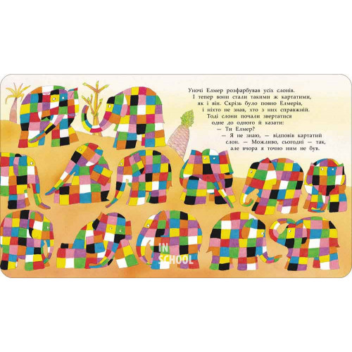 І знову Елмер, Девід МакКі 978-617-7385-48-5 Пригоди Елмера продовжуються! Картатий слон і дня не може прожити без жартів. Ви навіть не уявляєте, що він вигадав цього разу.Наближається День Елмера — веселе свято, коли сірі слони фарбуються в яскраві кольори. Усі надто зосередилися на підготовці до святкового параду, і Елмер занудьгував. Щоб покращити настрій собі та друзям, дивак вирішує утнути неймовірний жарт. І ось серед ночі, поки слони спали, Елмер…