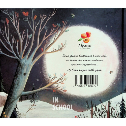 Нічні вогники Елли 978-617-8100-07-0 Надзвичайна історія про крихітну дівчинку Еллу. Тендітні крильця, вусики, як у метелика і серце, сповнене добра й любові до інших.Збираючи світло вночі, вона щедро ділилась ним з тими, хто потребував цього найбільше.Але ж добро має властивість повертатись до того, хто його випромінює, тож одного дня друзі Елли допоможуть її найбільшій мрії здійснитись: світло зірок перетвориться на світло…