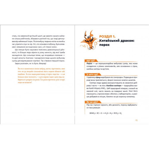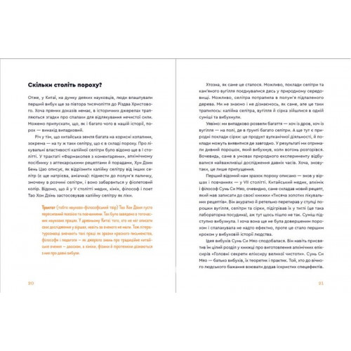 Видавництво Старого Лева Вибухова історія людства. - Юлія Смаль 978-966-679-963-3 Коли люди навчилися використовувати вогонь, це змінило їхнє життя. Згодом вони винайшли порох, грецький вогонь, вибухівку і вогнепальну зброю. Зброярі експериментували, алхіміки та хіміки поєднували різні елементи й отримували несподівані реакції та вибухові суміші. А нині ми маємо бойові отруйні речовини і ядерну зброю, вічне джерело енергії, яке водночас може спричинити техногенні катастрофи і радіаційне зараження. Що буде далі – залежить від нас. Хочеш пройти шлях від винайдення пороху і грецького вогню до динаміту і ядерних бомб – гортай цю книжку. Буде захопливо, бо це справді вибухова історія.