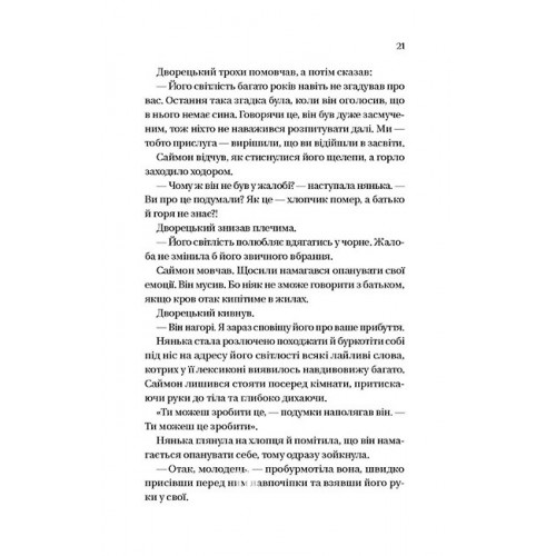 Бріджертони. Герцог та я., Джулія Куїнн 978-617-17-0028-4 В епоху Регентства всі бальні зали та вітальні Лондона скуто неписаними й непорушними правилами: як говорити з графом, який кніксен належить виконувати перед принцом… Герцог має бути владним і байдужим, а юна леді шлюбного віку — доброзичливою, утім не занадто.Дафна Бріджертон, четверта з восьми нащадків навдивовижу дружної шляхетної родини, має привітний характер, на противагу більшості чванливих панянок свого віку, тож легко знаходить спільну мову чи не з усіма парубками лондонських верхів. А от цікавої шлюбної пропозиції для своєї старшої доньки віконтеса Бріджертон ніяк не дочекається. Саймон Бассет, герцог Гастінґс, недавно повернувся з-за кордону й намагається уникати світського гамору, ба навіть виходів у світ, адже вирішив ніколи не одружуватися. На те в нього є особисті мотиви, спричинені родинною драмою. Знайомство із сестрою найліпшого друга Ентоні Бріджертона відкриває для нього інший шлях. Якщо Дафна погодиться на їхнє вдаване залицяння, Саймон зможе відмовляти матерям юних панянок, котрі завзято прагнуть уваги нежонатого герцога. Натомість Дафна побачить нові перспективи, а її репутація злетить у небеса. Чи спрацює цей план, якщо в жорстокому, блискучому, оповитому плітками світі лондонської еліти правдиве лише одне: кохання не стримати правилами.