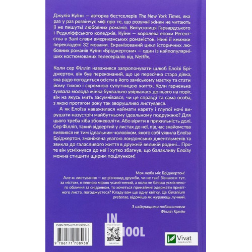 Бріджертони. Книга 5. Серові Філліпу з любов'ю., Джулія Куїнн 978-617-17-0893-8 Коли сер Філліп наважився запропонувати шлюб Елоїзі Бріджертон, він був переконаний, що це пересічна стара діва, яка радо погодиться осісти в його заміському маєтку та стати йому тихою і скромною супутницею життя. Коли гарненька зухвала молода жінка буквально увірвалася до нього на поріг, він на якусь мить засумнівався, чи це справді та сама особа, з якою протягом року так зворушливо листувався.А як Елоїза наважилася наймати карету і глупої ночі вирушати назустріч майбутньому ідеальному подружжю? Для цього треба хіба збожеволіти. Або вірити в прихильність долі. Сер Філліп, такий відвертий у листах до неї, під час знайомства виявився не тим ідеальним чоловіком, якого собі уявила Елоїза Бріджертон, зманіжена увагою лондонських джентльменів та звикла до галасливого життя в дружній великій родині... Проте він усміхнувся до неї і хутко збагнув, що балакливу Елоїзу можна стишити щирим поцілунком!