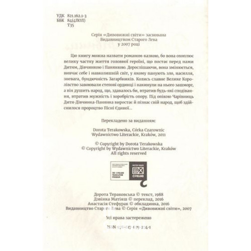 Видавництво Старого Лева Дочка чарівниць. - Дорота Тераковська 978-617-679-274-1 Цю книгу можна назвати романом-казкою, бо вона охоплює велику частку життя головної героїні, що постає перед нами Дитиною, Дівчинкою і Панянкою. Дорослішаючи, вона змінюється, вивчає себе і навколишній світ, у якому панують зло, насилля, зневага, бундючність Загарбників. Колись славне Велике Королівство завоювали степові ординці і накинули на нього зашморг, а він душити народ, що, здавалось бі, втратив будь-які сподівання, втратив мужність і хоробрість опору. Під опікою Чарівниць Дитя-Дівчинка-Панянка виростає й пізнає свій народ, щоб здійснилося пророцтво Пісні Єдиної...