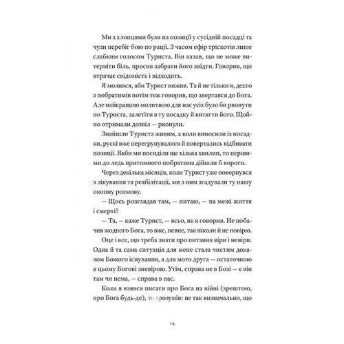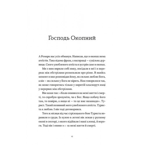 Автор говорить про себе, переповідає реальність та сни, але передовсім фіксує життя на межі. Розповідає про людей великої Любові, на яких все й тримається. Тут об?являється Господь Окопний, починається Найновіший Завіт, стає опорою українська культура в рюкзаку, а визнані метри воєнної літератури не витримують випробування реальністю. Їм про нас, українців, нічого не відомо. Про себе можемо говорити тільки ми, бо на Східному фронті все змінилось. І Артур Дронь говорить про це відверто і прямо. Як говорять ті, які були на межі. І повернулися.