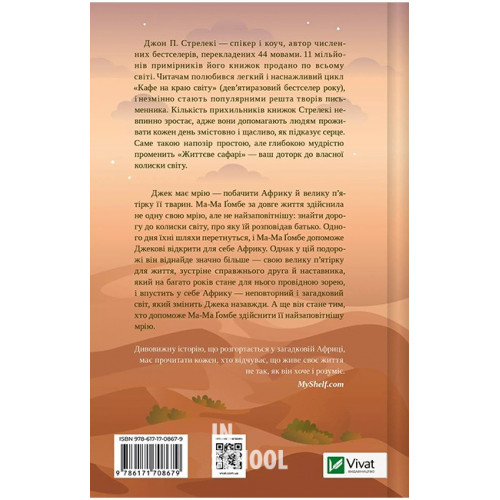 Життєве сафарі., Джон П. Стрелекі 978-617-17-0867-9 Книга «Життєве сафарі» — це путівник з усвідомленого життя від письменника Джона П. Стрелекі, творця легендарної серії «Кафе на краю світу» й мотиваційної прози «Велика п'ятірка для життя». Психолог і мандрівник надихнув десятки тисяч людей пройти крізь великі трансформації та пізнати відчуття щастя й наповненості. Автор написав про подорож, яка радше стала мандрівкою головного героя до самого себе.Джек прагне нових вражень. Чоловік вирушає до Африки, а його провідницею стає жінка, яку звуть Ма-Ма Ґомбе. У діалогах з якою він порушує теми саморозвитку, духовного зростання й пошуку сенсу життя.