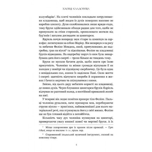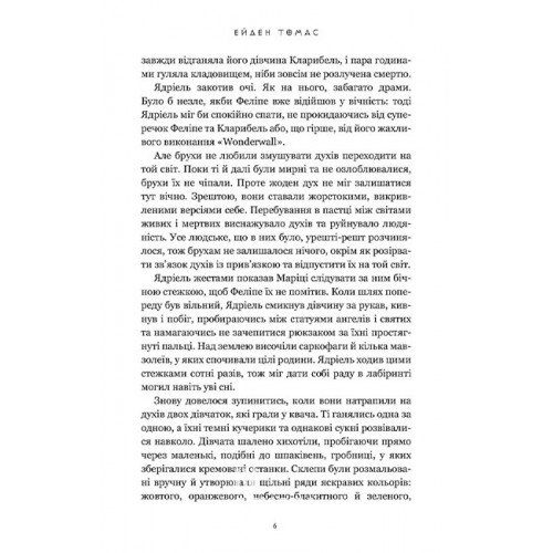 Видавництво "ARTBOOKS" Хлопці кладовища., Ейден Томас 978-617-523-306-1 Сім'я Ядріеля не вірить у те, що він може бути брухо. Намагаючись довести протилежне й отримати визнання родини, хлопець разом із кузиною та найкращою подругою на ім'я Маріца йде викликати духа свого кузена, щоби дізнатися обставини його смерті й допомогти перейти у загробний світ.Однак натомість Ядріель викликає духа місцевого поганого хлопця Хуліана Діаса, який точно не збирається вмирати з кінцями й прагне з'ясувати, що з ним сталося. Не маючи вибору, Ядріель погоджується допомогти.Але чим довше Хуліан тут, тим менше Ядріелю хочеться його відпускати…