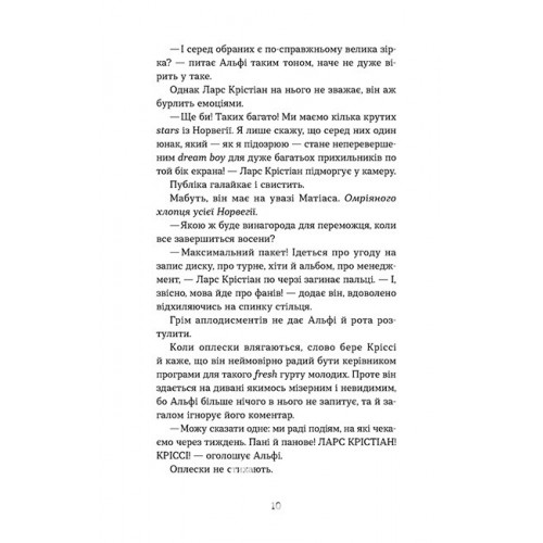 Видавництво Старого Лева Мій коханий — знаменитість. - Кірсті Крістофферсен 978-966-448-390-9 Здається, кохання, яке зародилося влітку і якому поклало край завершення канікул, переслідує Кароліну. Раптом вона бачить фото Матіаса, хлопця, з яким познайомилася на кемпінґу, на гігантському плакаті «Фабрики зірок» біля місцевого супермаркета. Матіас відтепер — «омріяний хлопець усіх нордичних країн»!