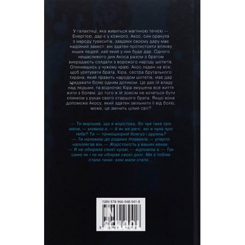 Кіра, сестра брутального тирана, який править народом шотетів, має дар завдавати болю одним дотиком. Це дає їй владу над людьми, та водночас Кіра змушена все життя жити з болем, до того ж їй зовсім не хочеться бути клинком у руках свого старшого брата. Якщо вона допоможе Акосу, який здатен звільнити її від болю, може, це змінить цілий світ?