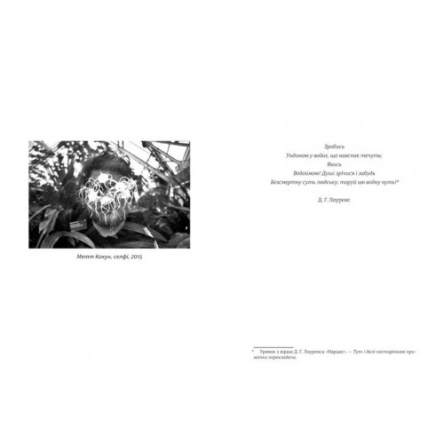 Книголав Нарцис у розквіті: Альтернативна історія селфі. - Метт Кохун 978-617-8566-04-3 Багато хто каже, що людство потопає в нарцисизмі, що технології зробили нас одержимими собою і ця тенденція всіх погубить. Британський автор Метт Кохун пропонує альтернативне бачення нарцисизму й селфі через повернення до первісного міфу про Нарциса й однойменну квітку, заперечуючи моралізаторство культурної критики про те, що зацикленість людства на собі призведе до його загибелі. Автор змушує задуматися, чи не є селфі вираженням прагнення до трансформації? І ким людина може стати, скинувши маску? Через фотографії й автопортрети автор досліджує явище нарцисизму, стверджуючи, що питання суб’єктності турбувало людей повсякчас.