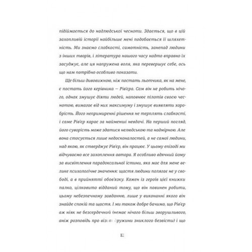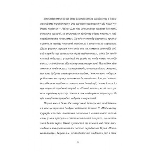 Книголав Нічний політ. - Антуан де Сент-Екзюперi 978-617-8439-44-6 Роман розповідає про культ своєчасної доставки пошти. Запровадження небезпечних нічних польотів, що гарантуватимуть перевагу у часі, стає фатальною помилкою директора мережі повітряних сполучень. За його ідеєю встановлюються жорсткі правила і графік, а політ має бути виконаний за будь-яких обставин.