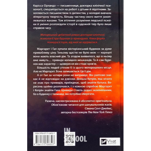 Вересневий дім., Карісса Орландо 978-617-17-0832-7 Маргарет і Гал купили вікторіанський будинок за дуже привабливу ціну. Їхньому щастю не було меж — нарешті вони мають власний дім. Та згодом виявилося, що в ньому вже живуть… привиди колишніх мешканців. Та й сам будинок має характер — щовересня він стікає кров’ю.Більшість людей утекли б із цього моторошного місця. Але не Маргарет. Вона залишається. Це її дім.А от Гал за чотири роки не витримує. Він раптово зникає й не відповідає на дзвінки. Донька Кетрін, яка нічого не знає про привидів, приїжджає, щоб знайти батька. Вересень щойно розпочався, і з кожною спробою Маргарет і Кетрін знайти Гала привиди стають дедалі жахливішими, бо в будинку є таємниці, які потрібно оберігати.